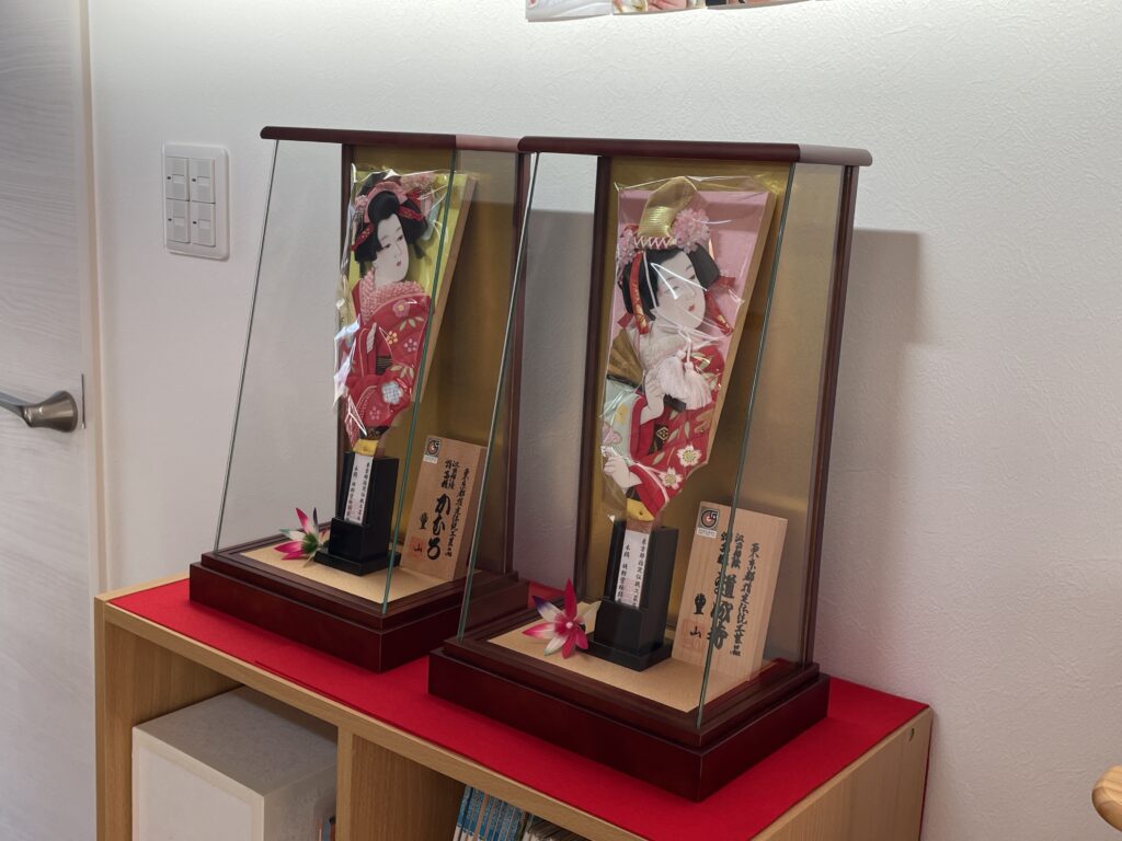 以前お買い求めいただいたお姉ちゃんの道成寺羽子板と並べてお飾りしました。