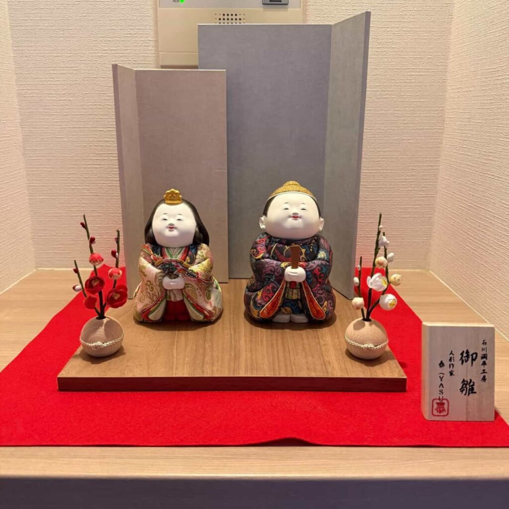 石川やすひろ作の立ち雛を綺麗に飾られています。