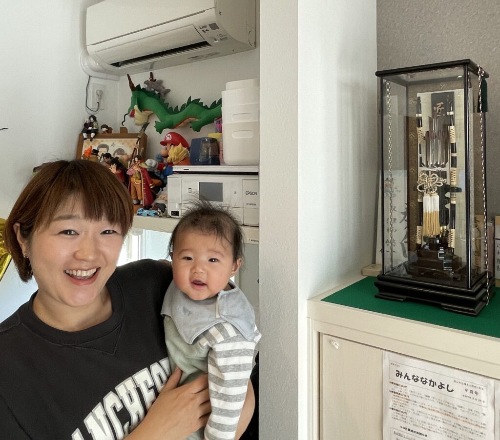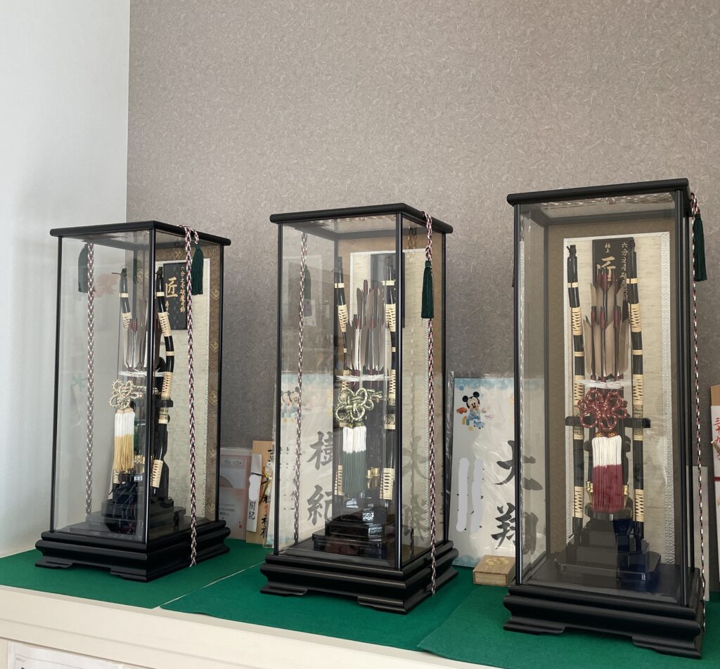 お部屋の飾り棚にお兄ちゃんの破魔弓と並べて飾らせていただきました。